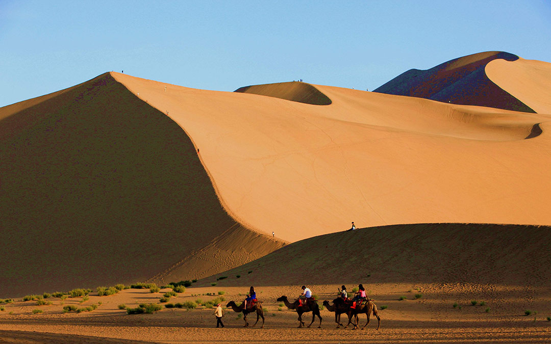 After lunch, 4hrs driving to Dunhuang to visit Echoing Sand Mountain, where you can ride the camels for 40mins to experience the beautiful desert scenery in the sunset.