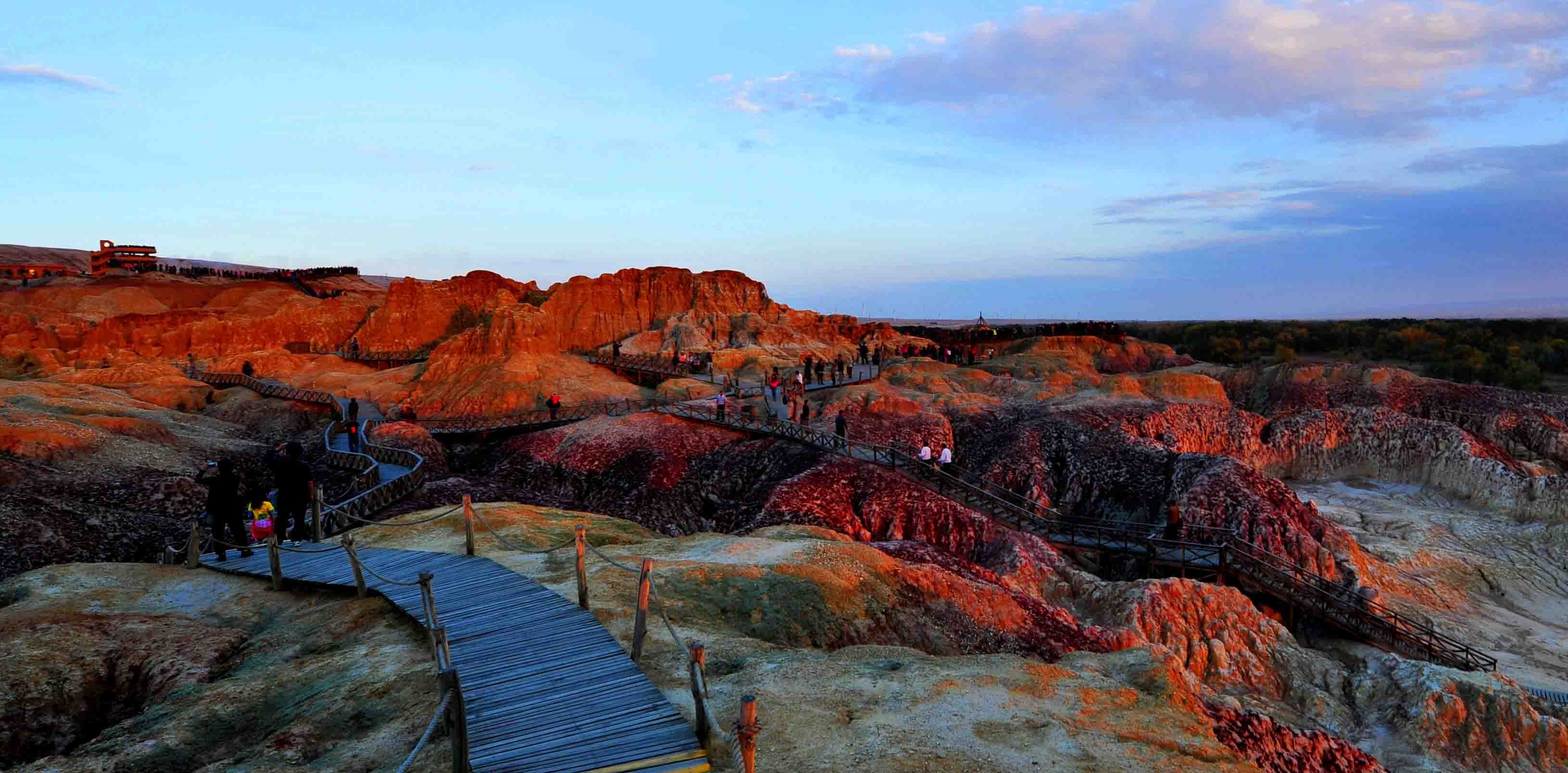 In the morning, start the trip off with the 3hours driving to Turpan, passing by Salt Lake and the wind power station which is the largest one in Asia spreading at the foot of Tianshan Mountain. Following glimpse of Salt Lake in Dabancheng. We'll be amazed by the histroical sites and oasis land of Turpan. A must and first visit is the oldest Uighur village Tuyoq Village located in the very center of Flaming Mountain Canyon. It used to be the holy site of Buddhism and Islam. The village consists of four parts: Canyon scenery, Thousand Buddha Caves, Maza tomb and the old buildings of the ancient village. Following a lunch in the traditional Uighur family in their grape yard, then we will proceed to visit the Bezeklik Grottoes, it has always been the Buddhist Center of Gaochang area, there are 57 existing caves and murals for you to visit. From here you can also enjoy the outlook of Flaming Mountains around the grottoes. The tour today end up to enjoy the sunset of Jiaohe Ruins with a history of 2,300 years lies between two rivers on a loess plateau atop a cliff of over 30m. It is one of the best preserved ruins of its ancient era in China, it was include in the World Heritage List on June 22, 2014.