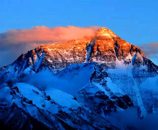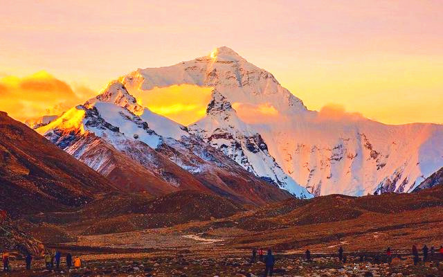 Behold Mount Everest's 8,848.86-meter summit from Rongbuk Monastery, witnessing golden dawn light cascading over the Himalayas' crown.