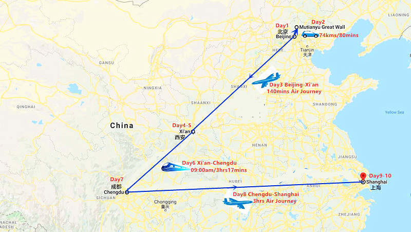 Domestic flights from Beijing to Xi'an and from Chengdu to Shanghai.