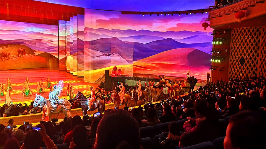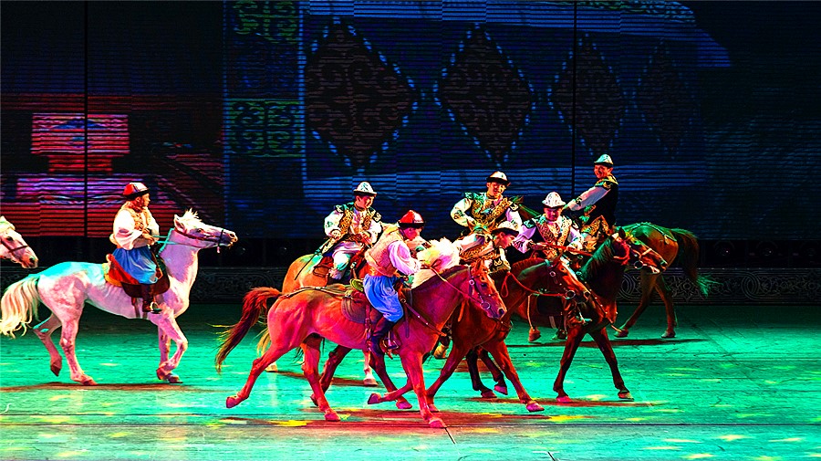 About Three hundred people. 2000 costumes. 3600 square meter LED screen. The performers are from a wide range of Chinese ethnic groups, from Han to Uygur to Kazakh to Tajik. The show includes folk dancing as well as acrobatics, ballet, ice-skating, high technology and even horse show. The performance is an extravagant exhibition of the rich culture and a perfect blend of modernity and traditions, in northwest China's Xinjiang Uygur Autonomous Region.