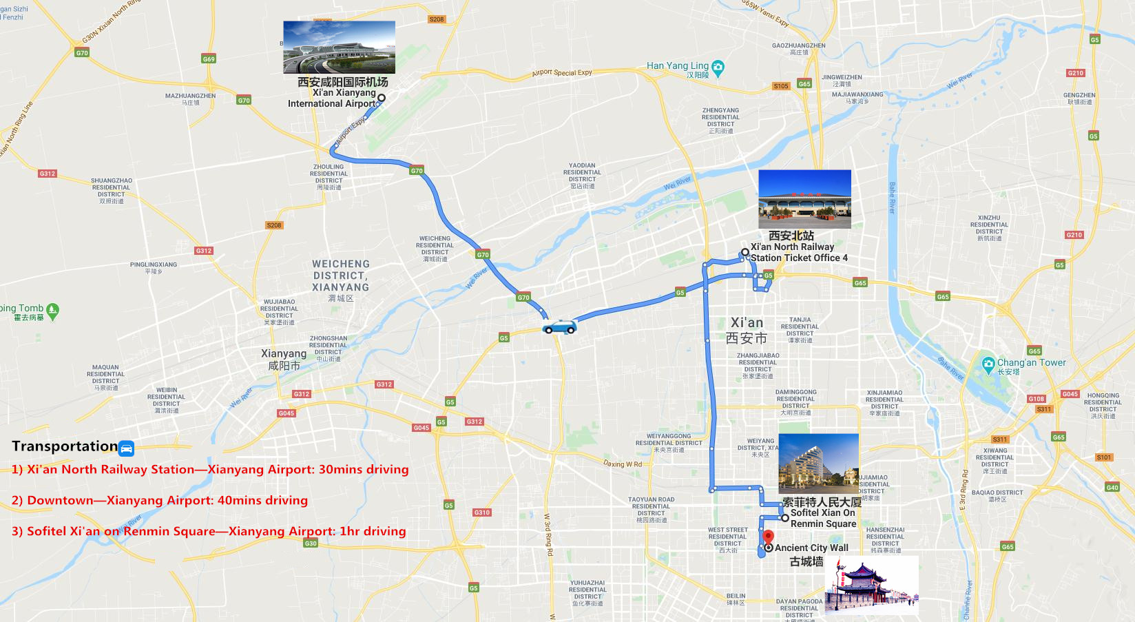 Private transportation from Xi'an Xianyang International Airport to the Hotel in the city of Xi'an.