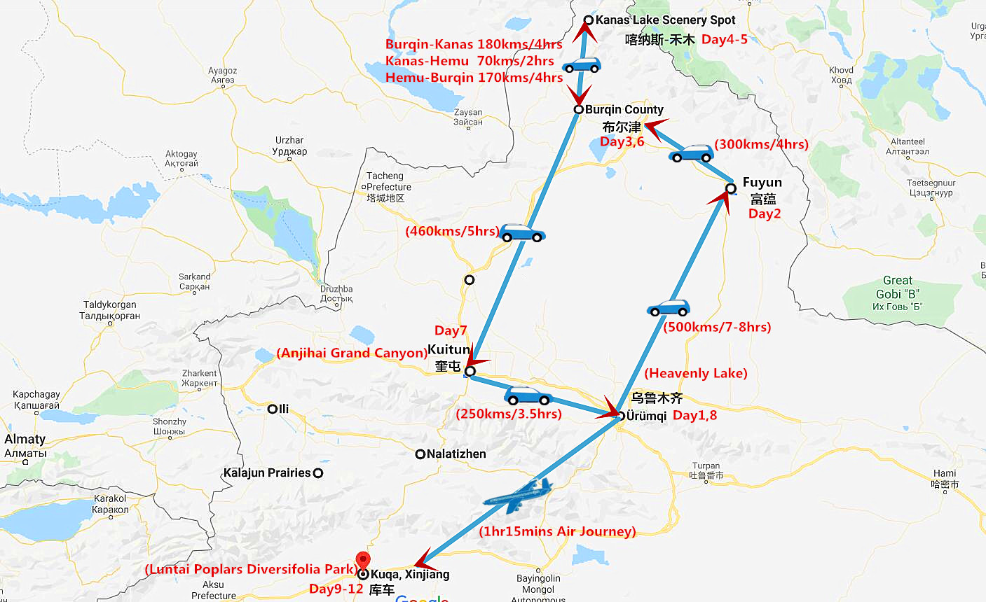 Destinations: Urumqi - Fuyun - Burqin - Kanas - Hemu - Kuitun - Kuqa