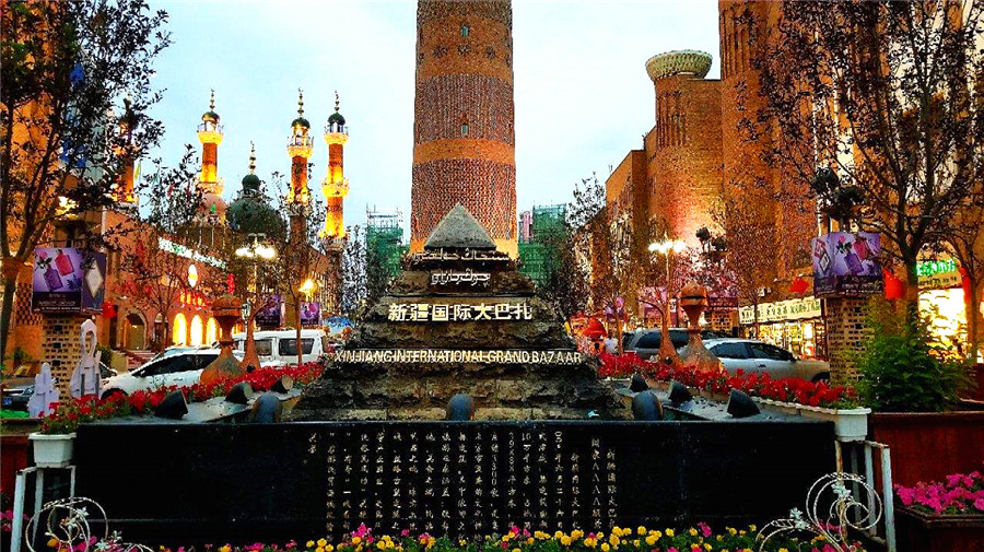 Excitement at the biggest bazaar in the world--- Xinjiang International Grand Bazaar. Amazed by the featured Islamic buildings and prosperous booths.