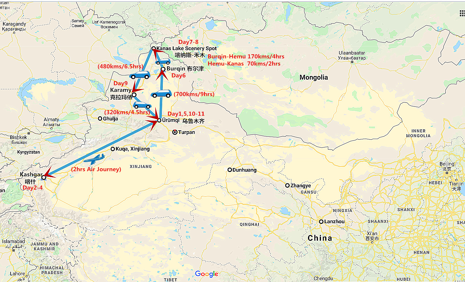 Destinations: Urumqi - Kashgar - Burqin - Hemu - Karamy