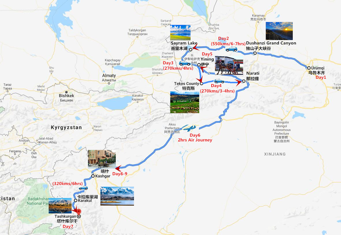 Destinations: Urumqi-Sayram Lake-Tekes-Narati-Yining-Kashgar-Taxkorgan