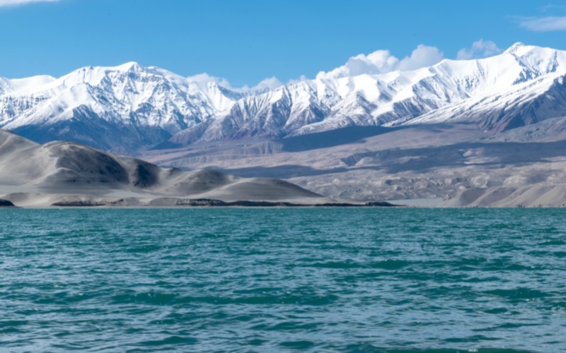 Marvel Karakul Lake, a high-altitude lake set at the foot of snowcapped Muztagh Ata (7,546m)